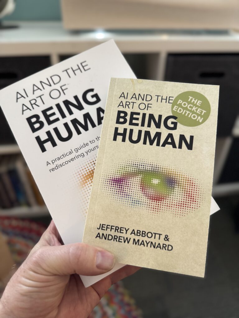 When Jeff Abbott and I were finalizing AI and the Art of Being Human last year, we had mockups printed in a bunch of different sizes and form factors. The published version ended up at 6″ × 9″ — a size that felt right for the business and management audience we were writing for, and one that sits well on a shelf or desk.